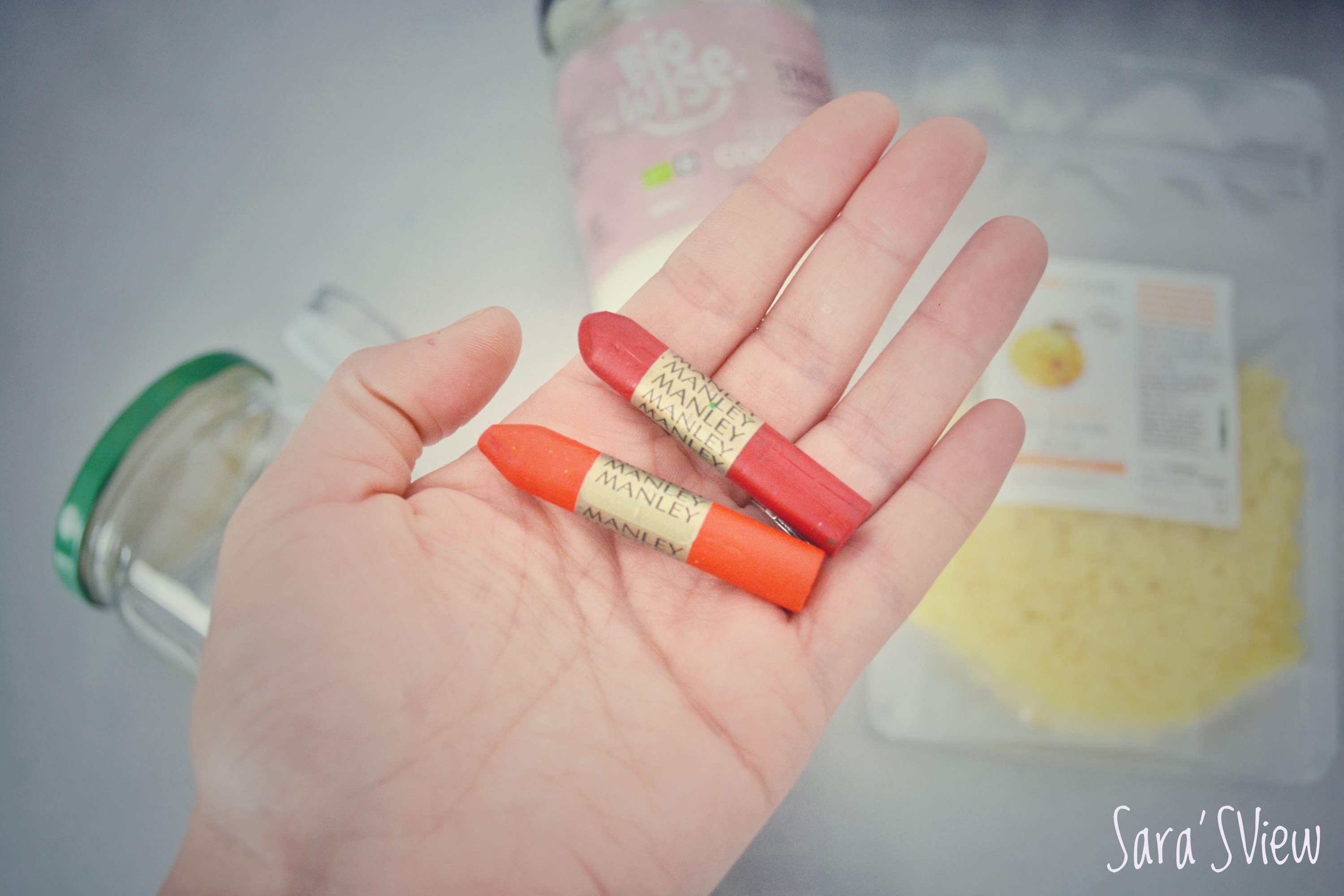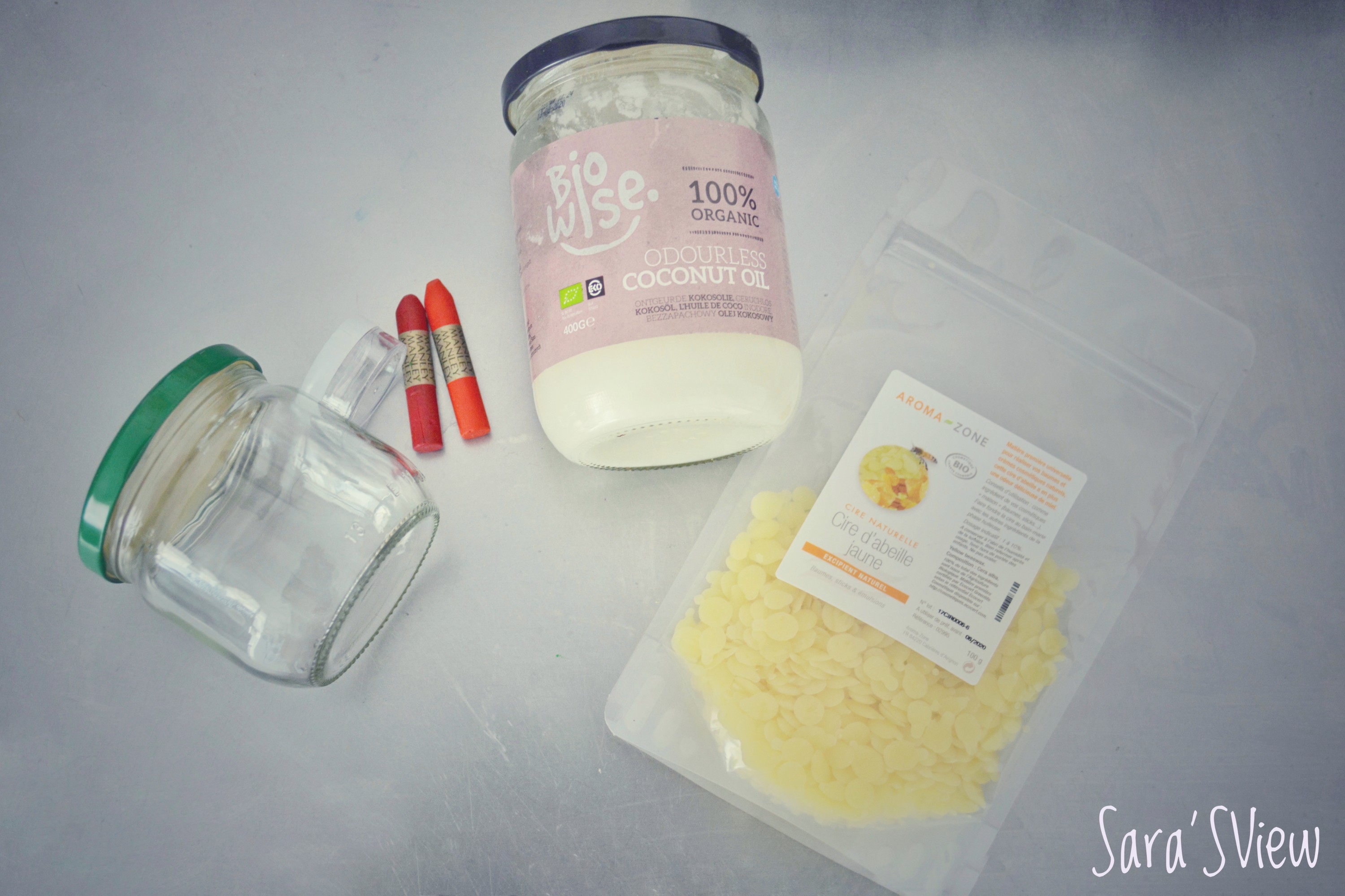 J’avais des restes de cire d’abeille ( que j’achète ici ) et d’huile de coco (de la fois où j’ai fait ma crème de visage ici) hidratante et réparatrice,et pour la couleur j’ai trouvé sur le net qu’on pouvait utiliser les cires du type Crayola. De mon côté j’ai utilisé la marque Manley.