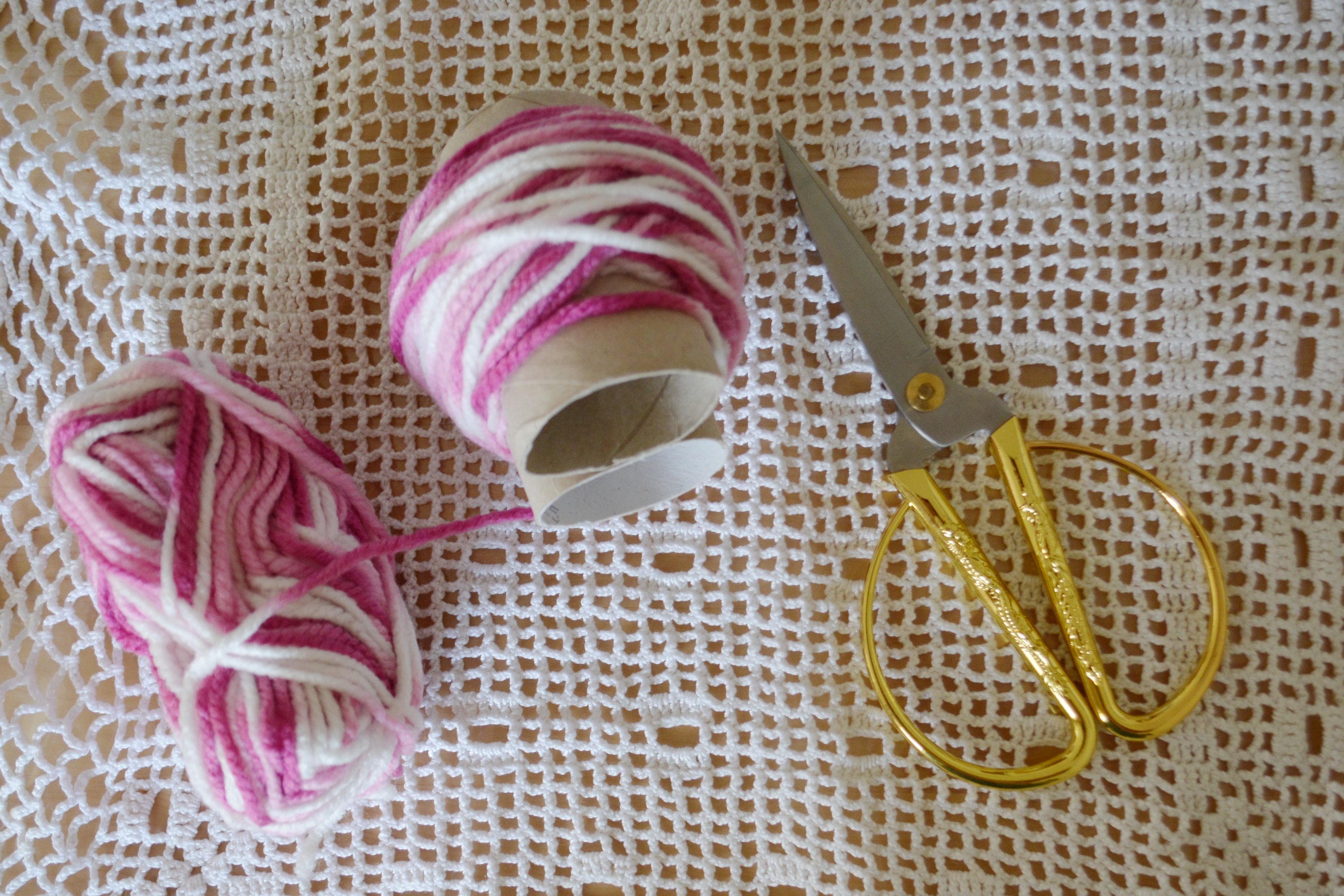 Roll the yarn around the paper rolls and then knot the ball,cut the edges and shape your pom-pom.