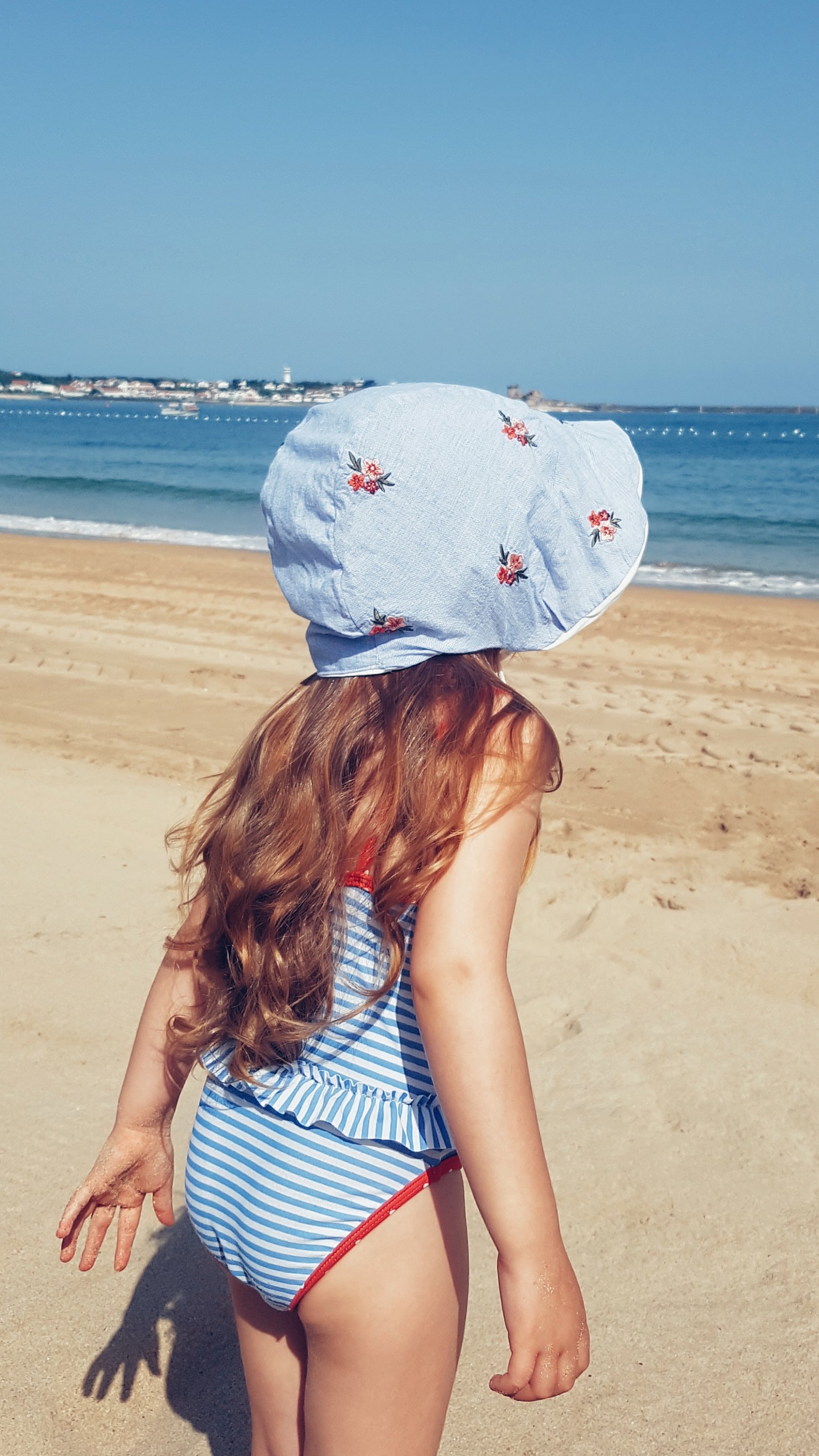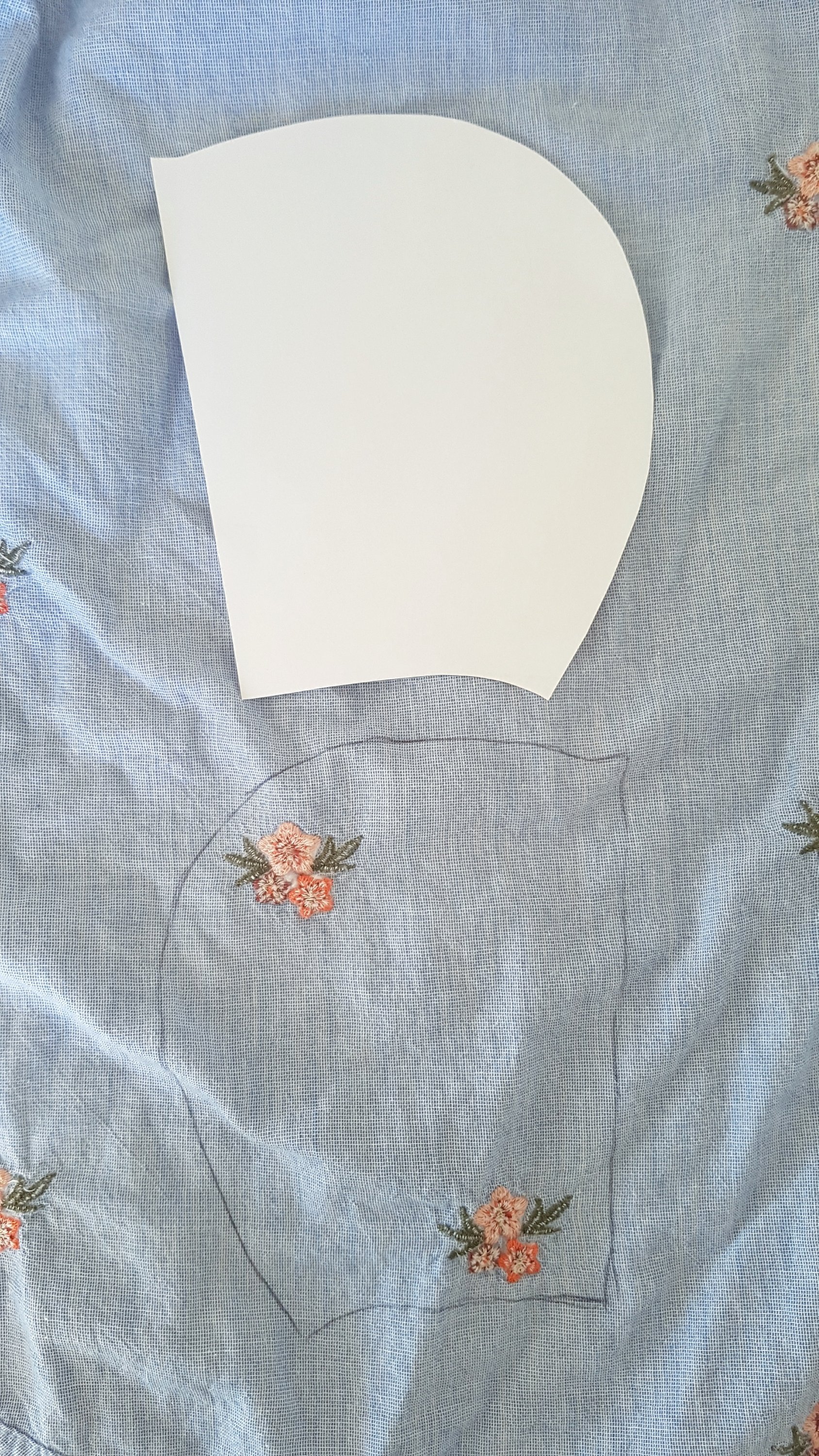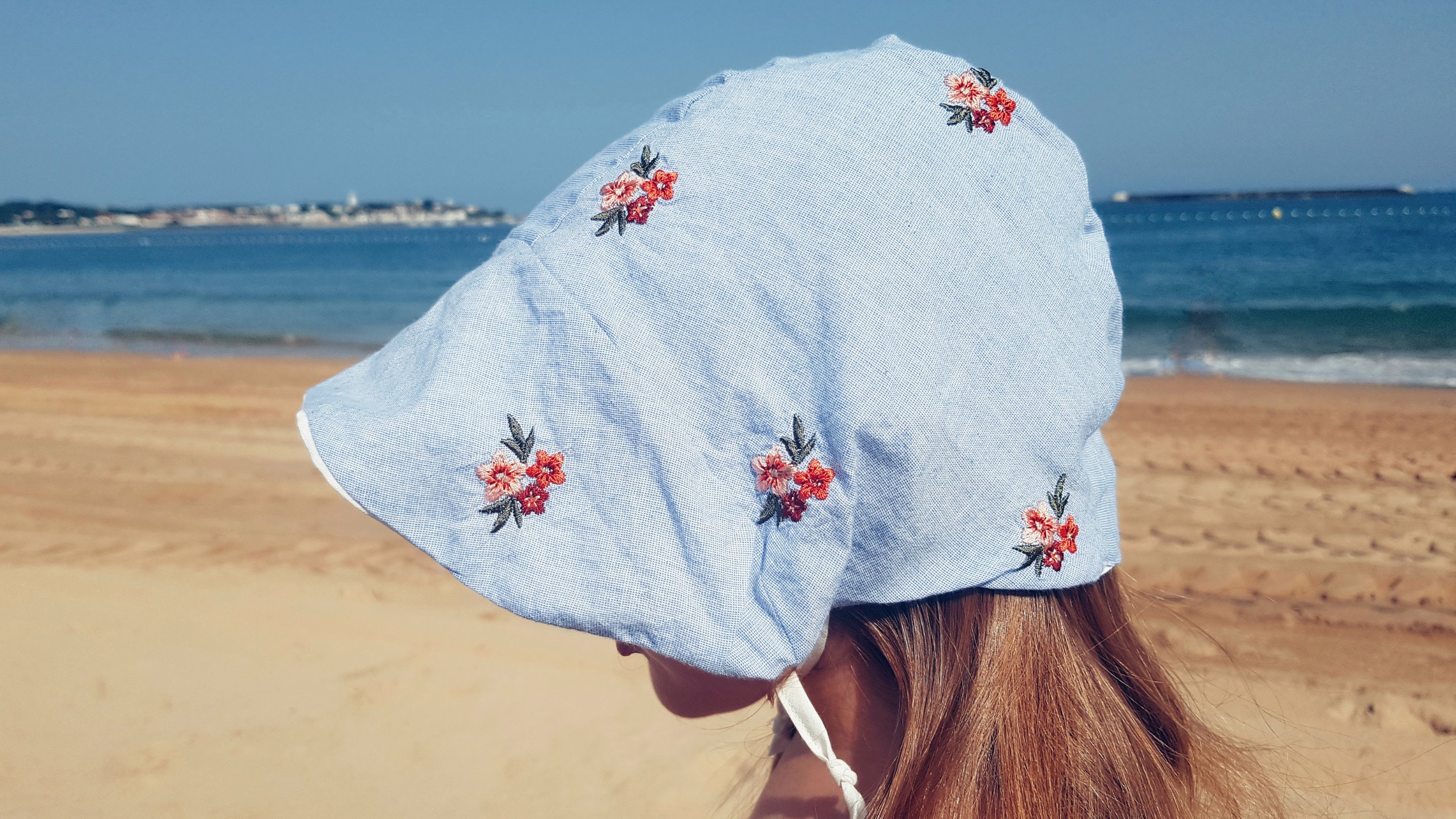 Then I was looking for embroidered fabric in order to sew two matched bonnets for my daughters,and unexpectedly found a beautiful thrifted shirt with the colors that I wanted: perfect! I could try a new pattern and make an upcycled item
