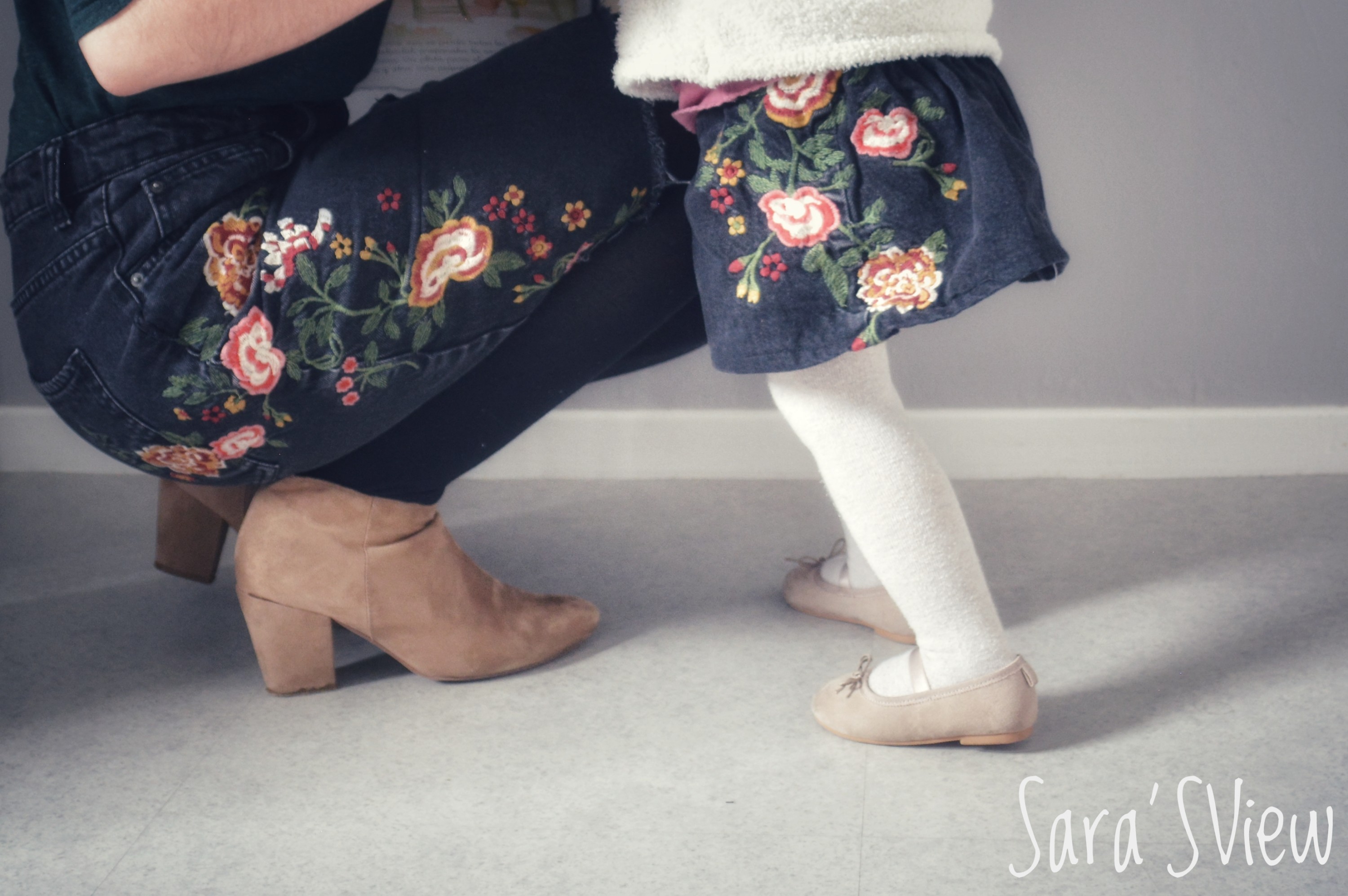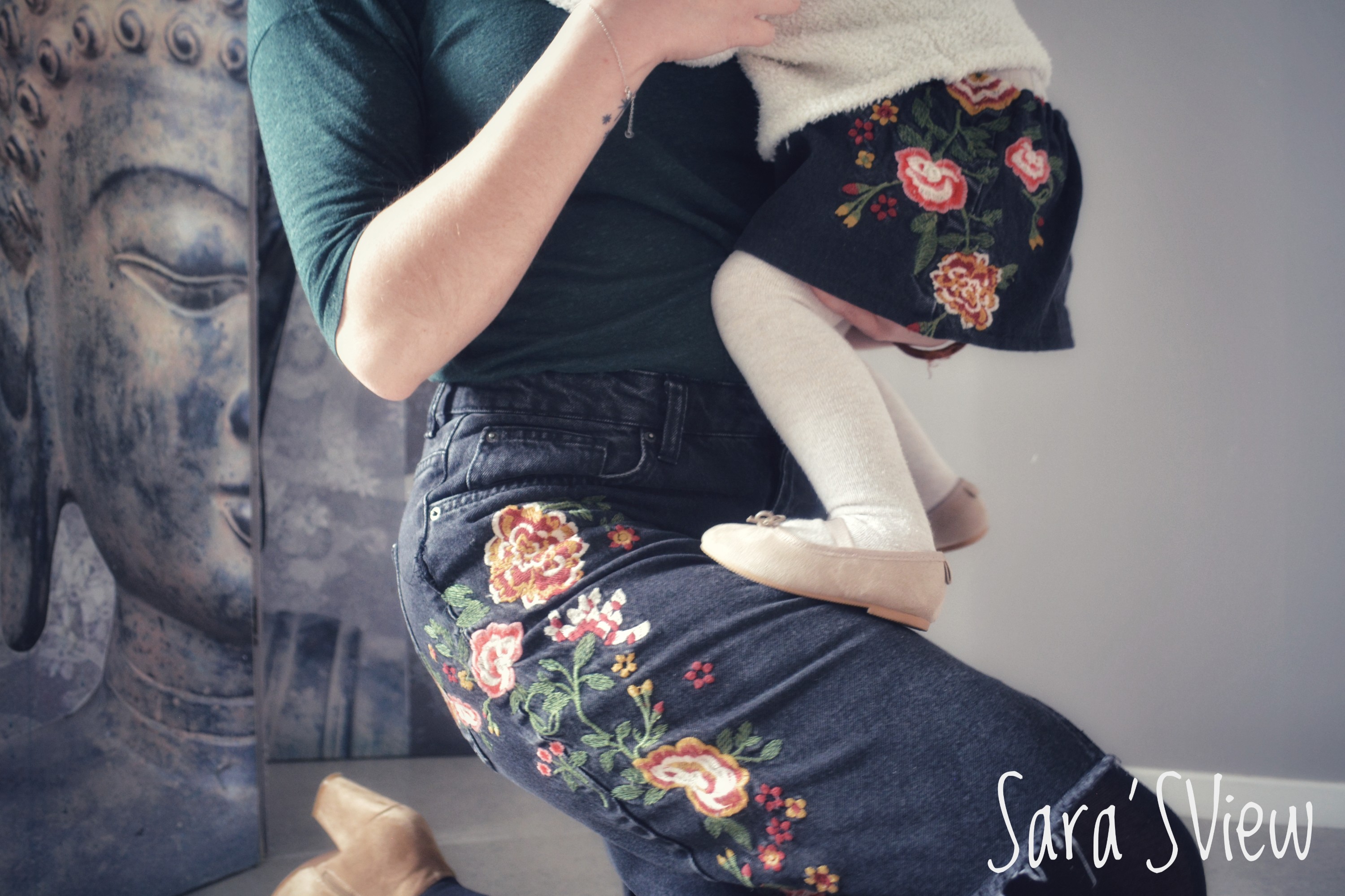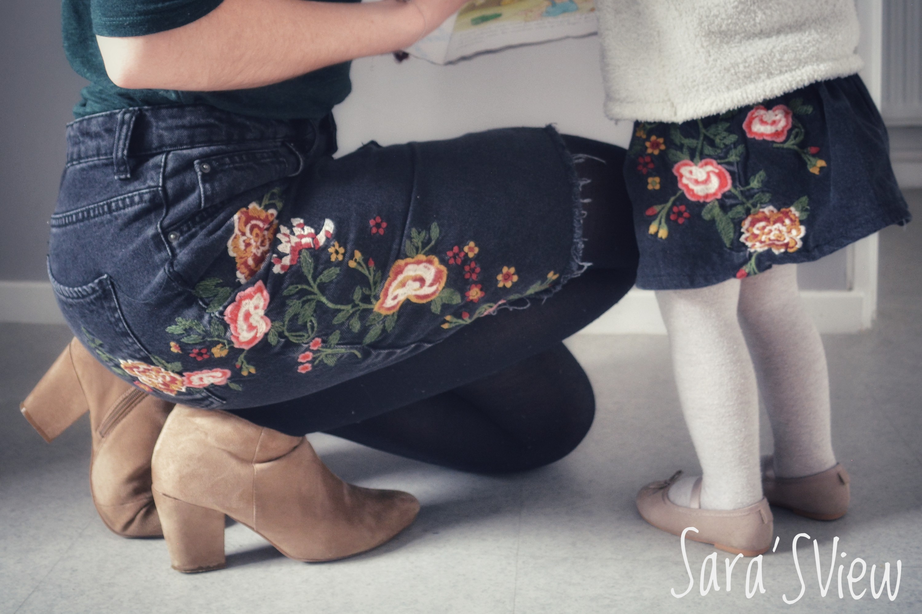 So here are some pictures of two skirts (one for me and one for my daughter) that I made with one embroidered old jean.