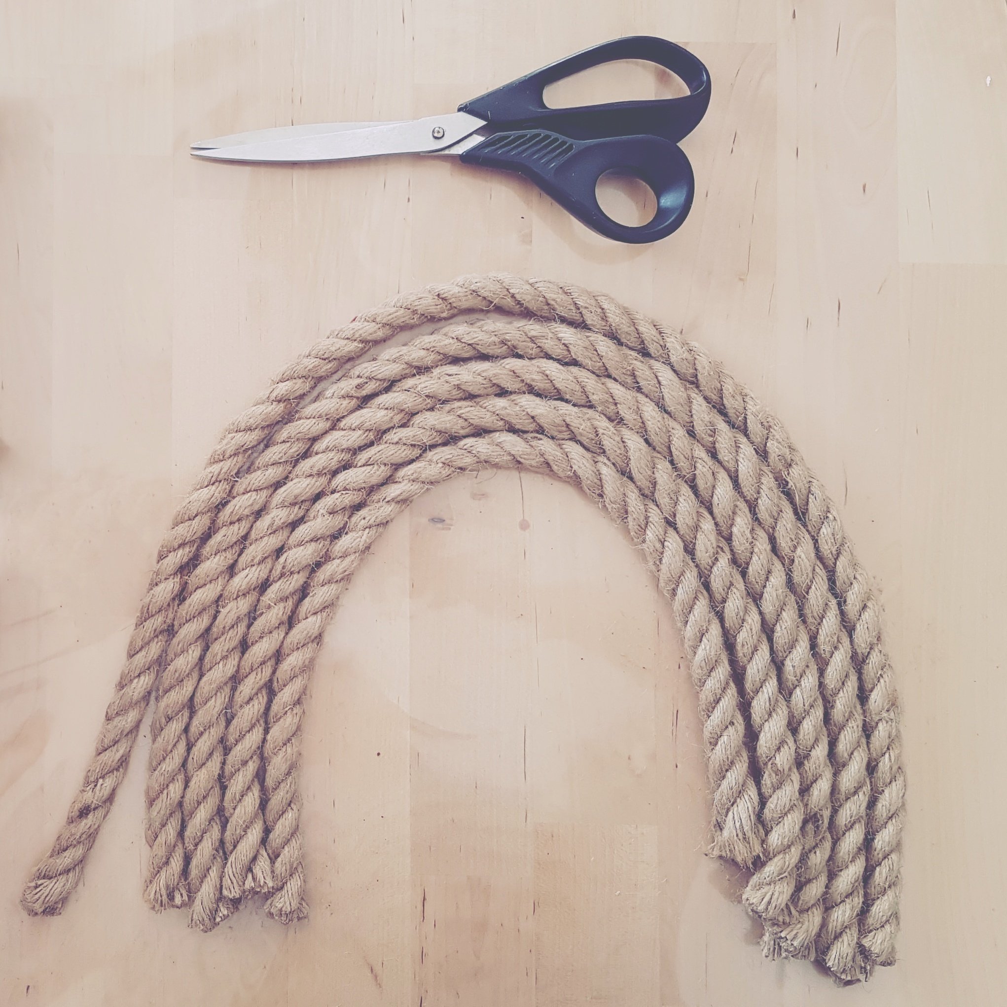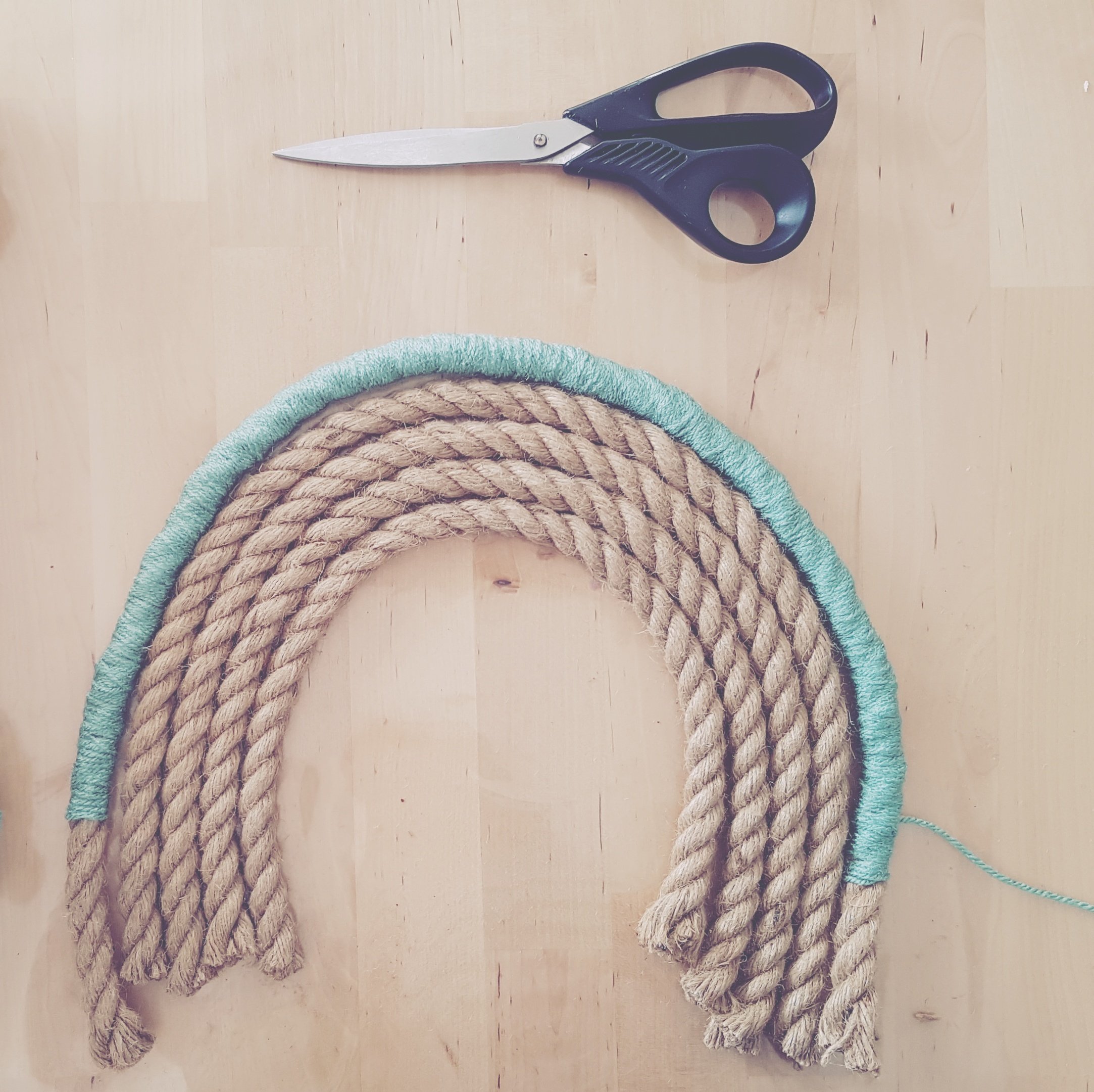 -laying out the rope in your rainbow shape. Cut each and leave enough extra rope for the fringe.
